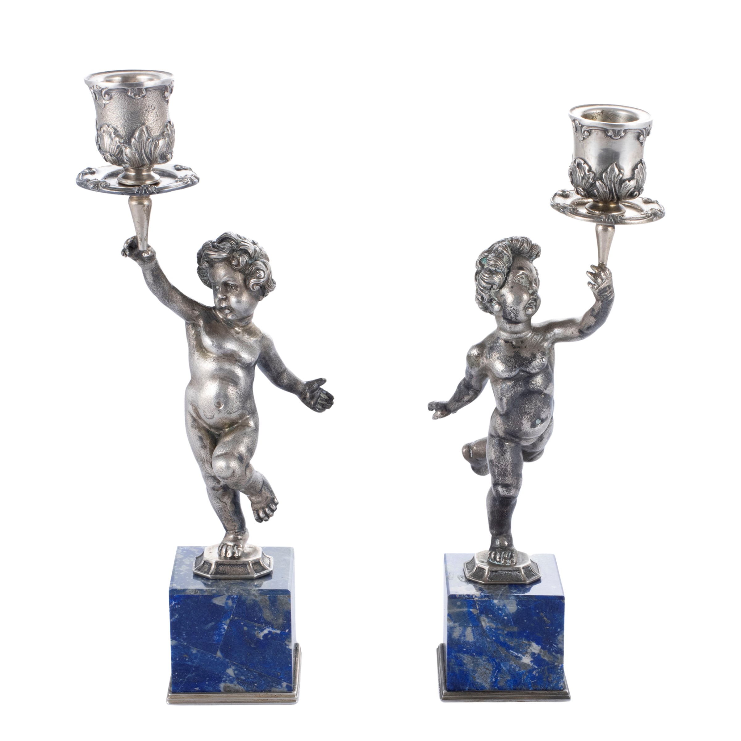 Coppia di candelieri in argento e lapislazzulo