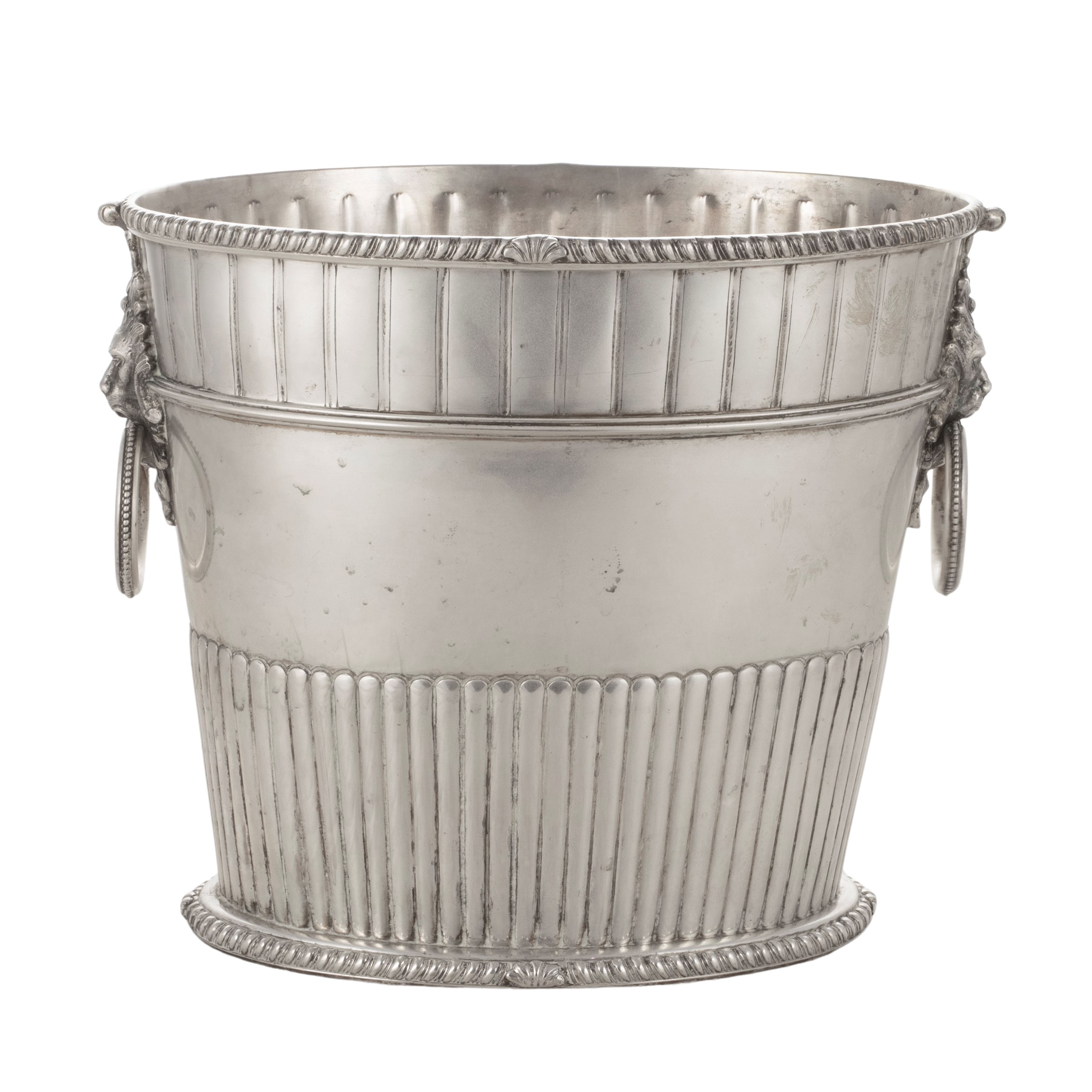 24,5x29x20 cm.sezione ovale a corpo liscio e baccellato, manici circolari trattenuti da teste leonine, peso 2289 gr