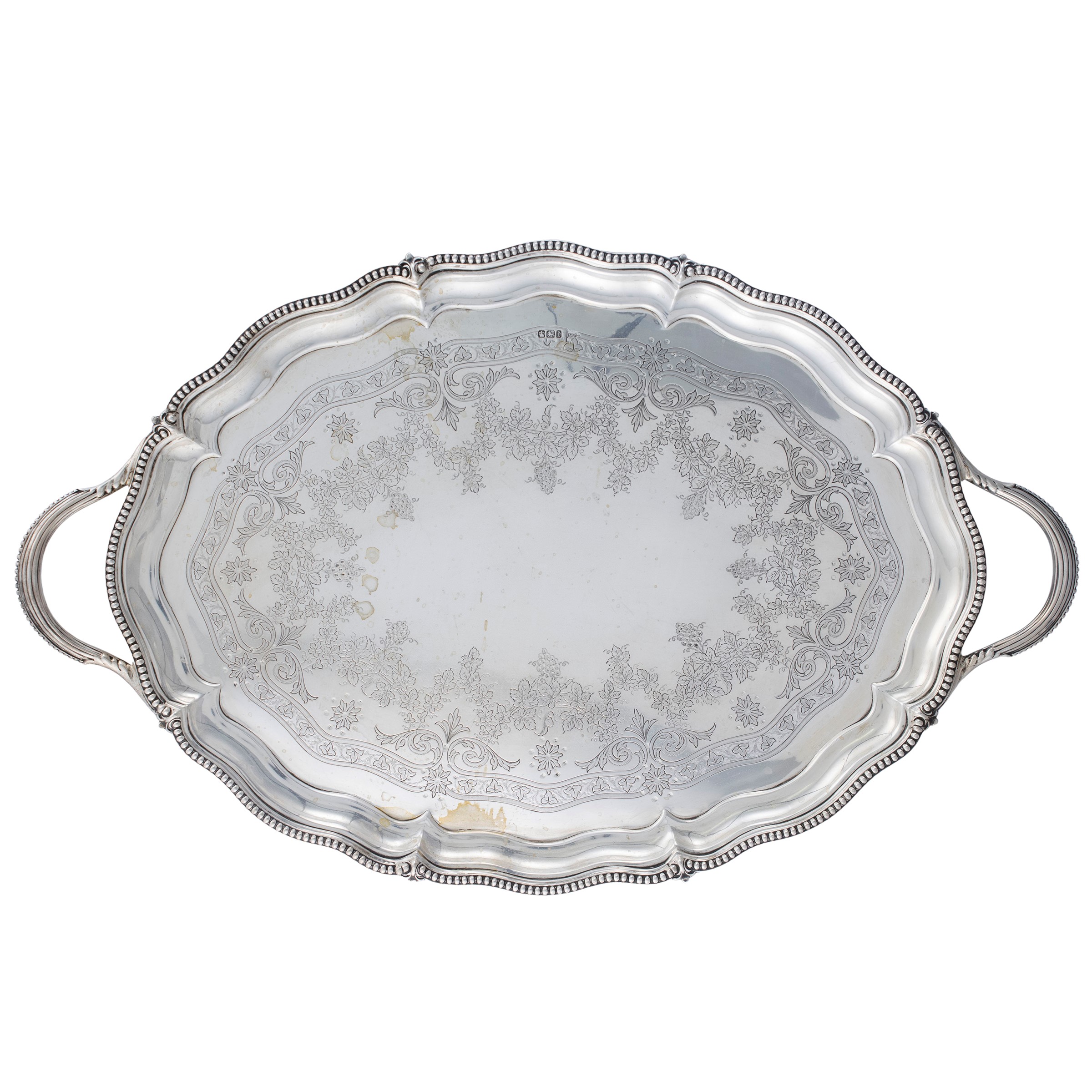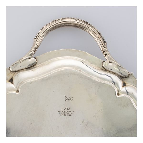 55x34 cm.argentiere Walker & Hall, forma ovale con bordo sagomato e perlinato, superficie incisa con motivi di foglie di vite e grappoli d'uva, peso 1840 gr