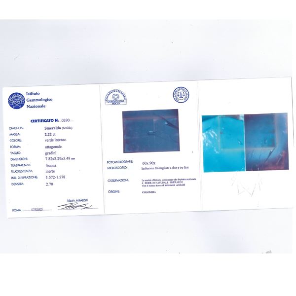 peso 5 gr.taglio ottagonale a gradini ct 2,22 circa, ai lati due diamanti taglio carré ct 0,90 circa, misura 14, completo di certificato gemmologico