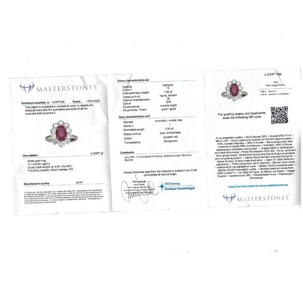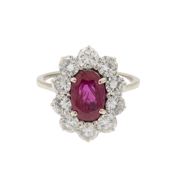 peso 46 gr.ct 1.50 circa, taglio ovale misto, privo di trattamento termico, contornato da diamanti taglio brillante ct 1,90 circa, misura 14, completo di certificato gemmologico