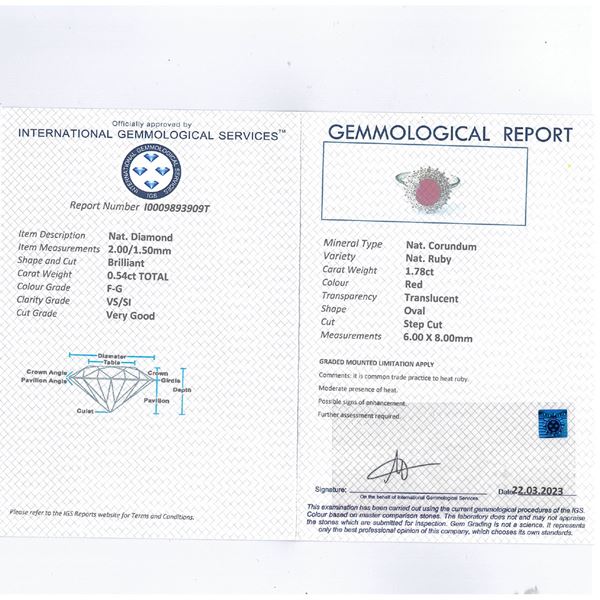peso 6 gr.rubino taglio ovale ct 1,78 circa contornato da diamanti ct 0,54 circa colore F-G - purezza VS/SI, dimensioni 1,9x1,3 cm. completi di certificato gemmologico