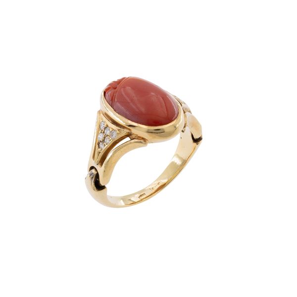 Anello in oro giallo 18kt e corallo scolpito a motivo floreale