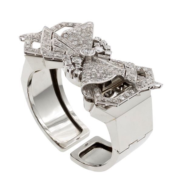 peso spilla 27 gr. - bracciale 55 gr.taglio brillante antico, un diamante centrale ct 0,80 circa e altri diamanti per ct 6 circa, uno mancante, completo di bracciale a manetta in oro bianco 18kt con chiusura a molla su cui si può inserire la spilla, spilla dimensioni 6,4x3,6 cm.