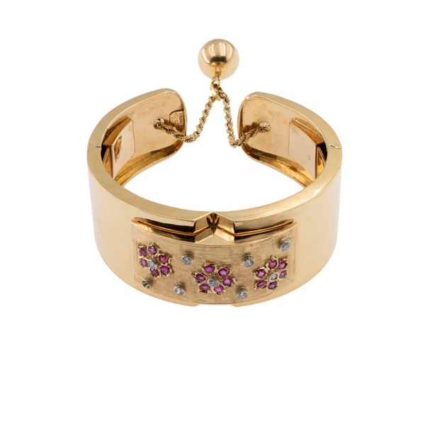 peso 76 gr.impreziosito da rubini tondi ct 1,30 circa e diamanti taglio brillante ct 0,45 circa, un diamante mancante, chiusura a molla, tre sfere pendenti con catena, diametro 6 cm.