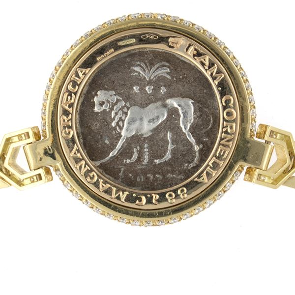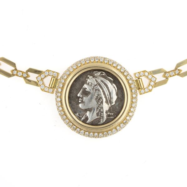 peso 94 gr.in oro giallo 18kt diamanti taglio brillante ct 6 circa, centrata da moneta in argento, diametro 3,3 cm. - lunghezza 52 cm. chiusura a scomparsa, completa di scatola originale