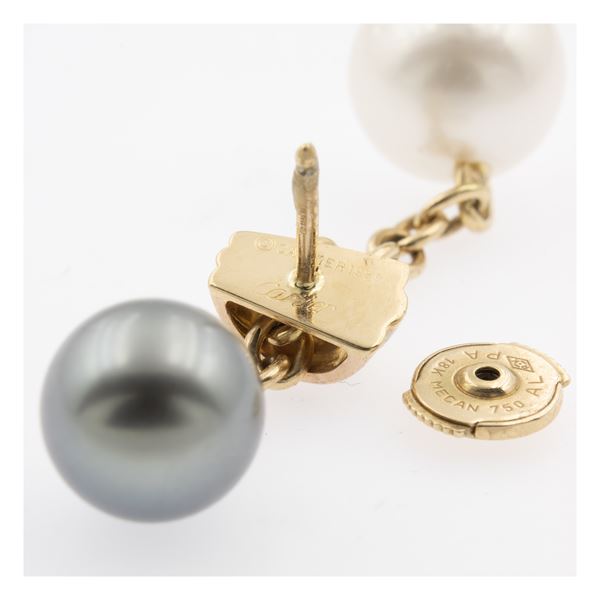 peso 13 gr.in oro a tre colori 18kt con due perle giapponesi 12 mm. circa e due perle Tahiti 10 mm. circa, lunghezza 4 cm.