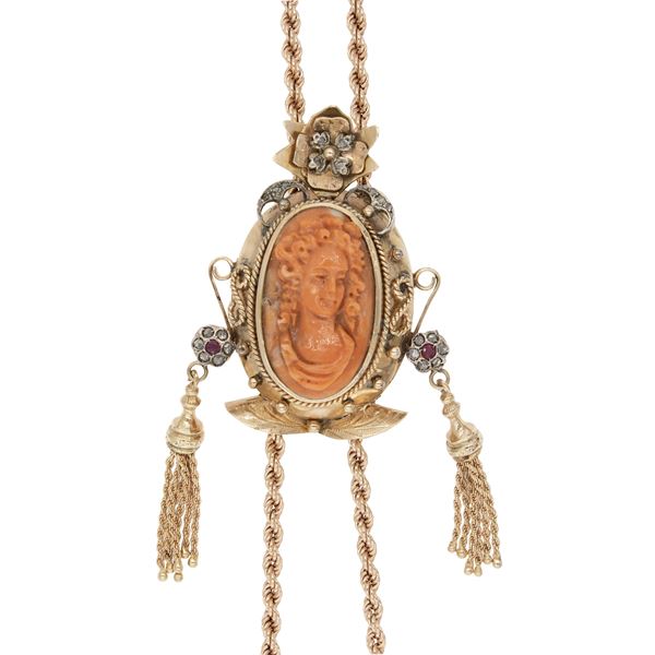 peso 53 gr.in corallo scolpito ed intagliato, argento, rose di diamante e rubini tondi con nappine pendenti, centrale dimensioni 6,5x4 cm. - collana lunghezza 110 cm.