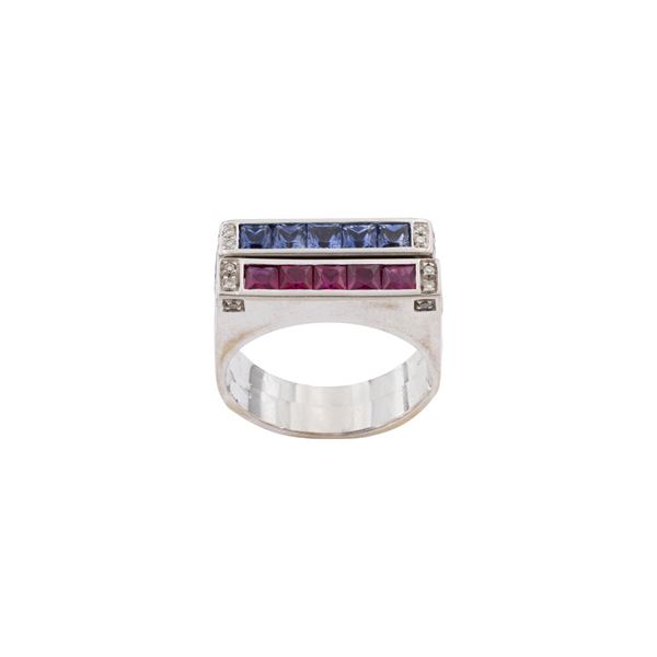 peso 14 gr.rispettivamente con zaffiri ct 1,60 circa e rubini ct 1 circa taglio carré alternati da diamanti taglio huit-huit, misura 18