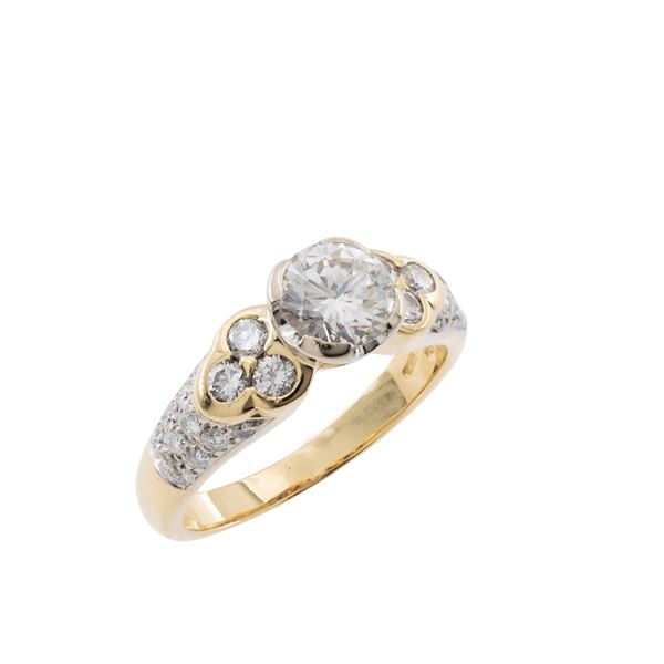 peso 8 gr.taglio brillante ct 1 circa ai lati altri brillanti ct 0,50 circa, misura 20