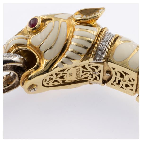 peso 181 gr.raffigurante due tigri in platino e oro giallo 18kt, smalto crema e diamanti taglio brillante ct 5 circa, occhi con rubini cabochon, chiusura a scatto a scomparsa, diametro 6 cm.