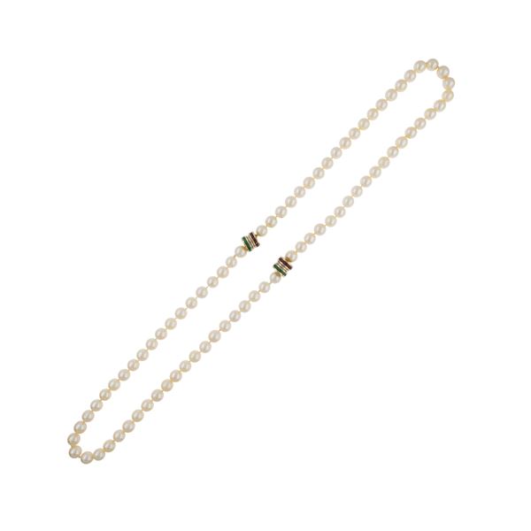 peso 91 gr.chiusure a cilindro in oro due colori 18kt con rubini e smeraldi tondi, perle 8,5/9 mm. lunghezza minima 38 cm. - massima 76 cm.