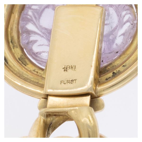 peso 71 gr.centrata da ametista scolpita a foggia di testa di leone e diamanti taglio brillante ct 0,20 circa, chiusura a scomparsa, lunghezza 42 cm.