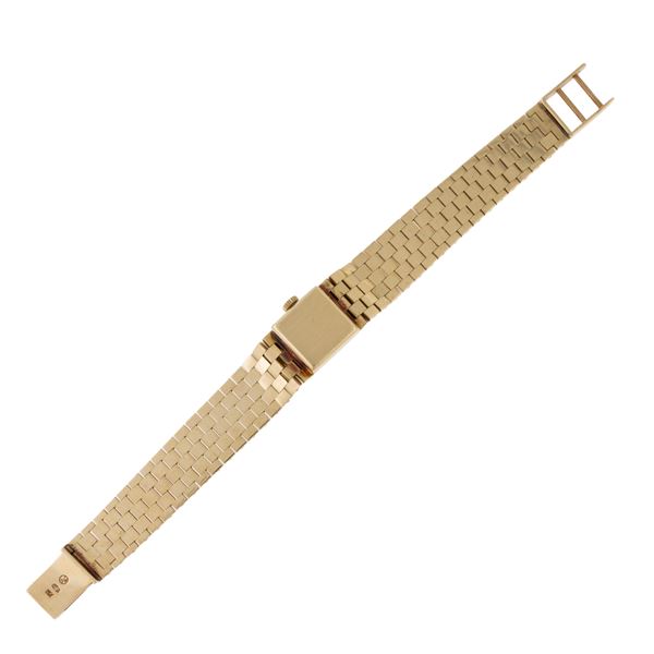 peso 47 gr.in oro giallo 18kt, ref. 859, cassa carré 25 mm. quadrante champagne con indici, segni di usura, movimento meccanico a carica manuale, calibro ebel 59, bracciale originale in oro giallo 18kt, lunghezza regolabile 18 cm.