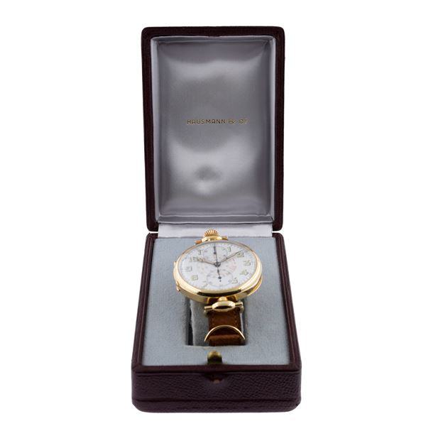 in oro giallo 18kt, cassa 45 mm. quadrante in smalto, numeri arabi e lancette al radio, corona di carica ore 12, due quadranti ausiliari per i secondi continui e contatore a 30', scala tachimetrica a chiocciola interna, movimento meccanico a carica manuale, da revisionare, cinturino regolabile, completo di scatola, cassa, quadrante e movimento firmati
