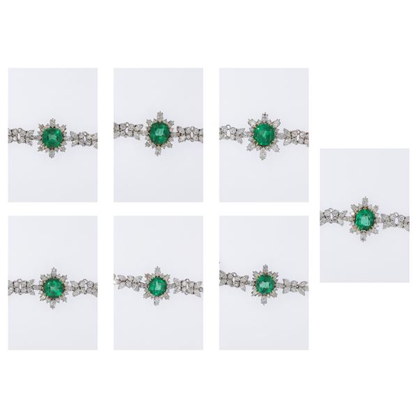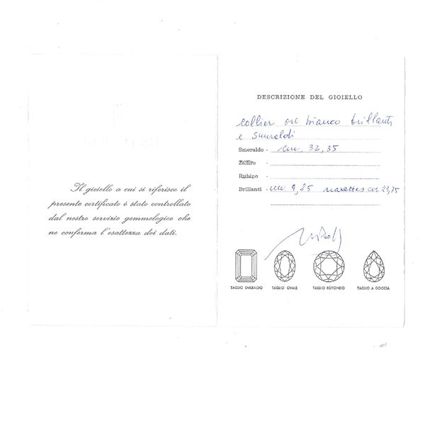 peso 69 gr.sette smeraldi taglio a cuscino misto ct 32,35 circa, privi di trattamento termico, alternati da diamanti taglio navette ct 19,75, diamanti taglio brillante ct 9,85 circa e diamanti taglio a goccia ct 4,50, colore G/H - purezza VVS/SI, montata in oro bianco e giallo 14kt, lunghezza 44 cm. completa di scatola e certificato gemmologico