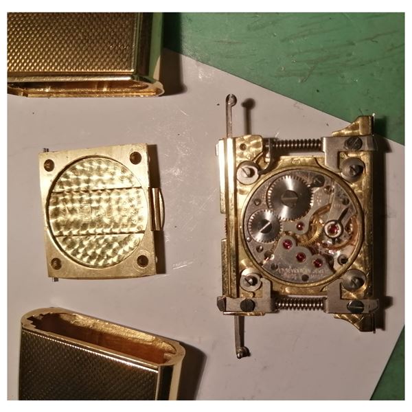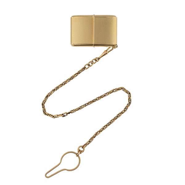 peso 86 gr.in oro giallo 18kt, ref. 165 - 3266, dimensioni 45x31 mm. quadrante argentato con indici a scomparsa, movimento meccanico a carica manuale che avviene attraverso la chiusura e apertura della custodia, calibro 105, completo di catena orologio in oro giallo 18kt, lunghezza 30 cm.