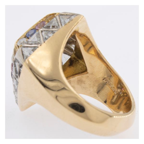 peso 14 gr.diamanti taglio a triangolo e brillante ct 2 circa, zaffiri tondi blu, rosa e gialli e peridoti, anello misura 12