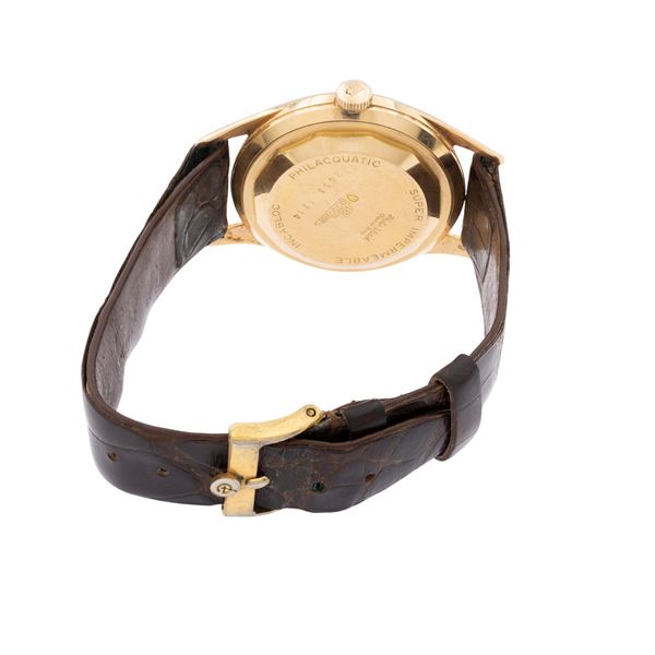 in oro giallo 18kt, ref. 2053 - 1214, cassa tonda 36 mm. quadrante rosato con indici, datario ore 3 movimento meccanico a carica automatica, calibro 61, cinturino con fibbia originale placcata oro, cassa, quadrante e movimento firmati