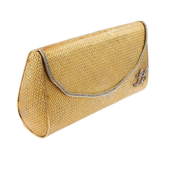 peso 428 gr.lavorato a cestino con iniziali L.C. chiusura a scatto con patta, impreziosita da diamanti taglio brillante ct 2, specchio all' interno, dimensioni 6,8x9,8x5,9 cm.