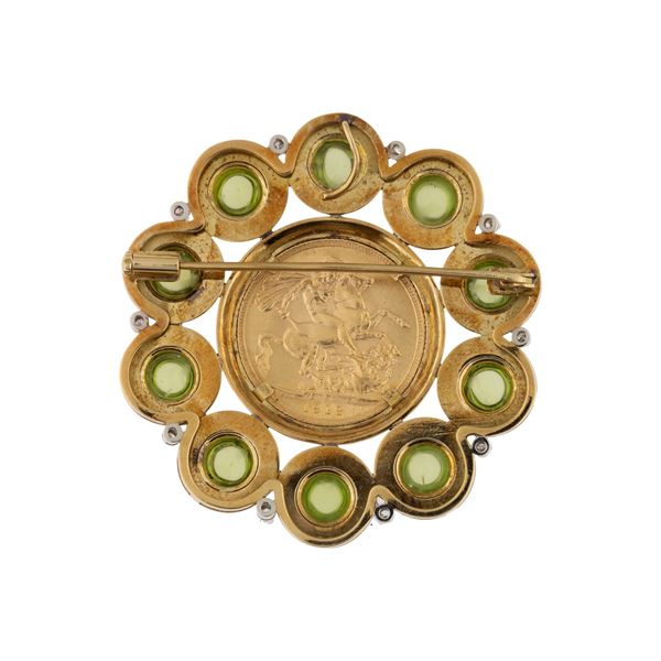 Spilla con sterlina in oro giallo 18kt peridoti e diamanti