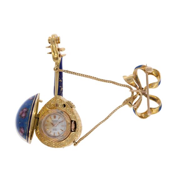 peso 36 gr.in oro giallo 18kt smalti policromi e diamanti taglio brillante, orologio a scomparsa Universal, cassa 15 mm. circa, quadrante argentato con indici dorati, movimento meccanico a carica manuale, calibro universal 541, cassa, quadrante e movimento firmati
