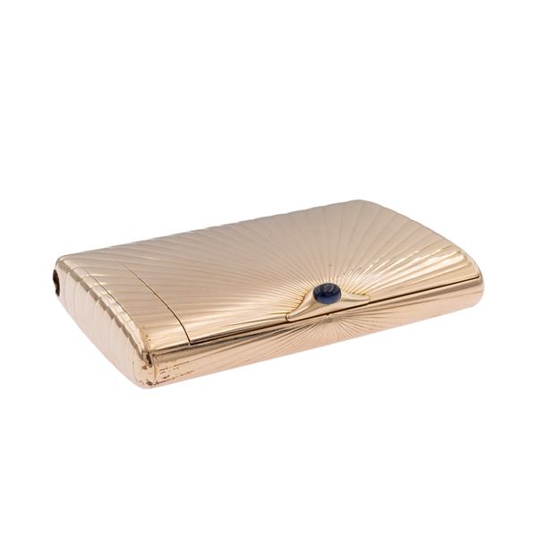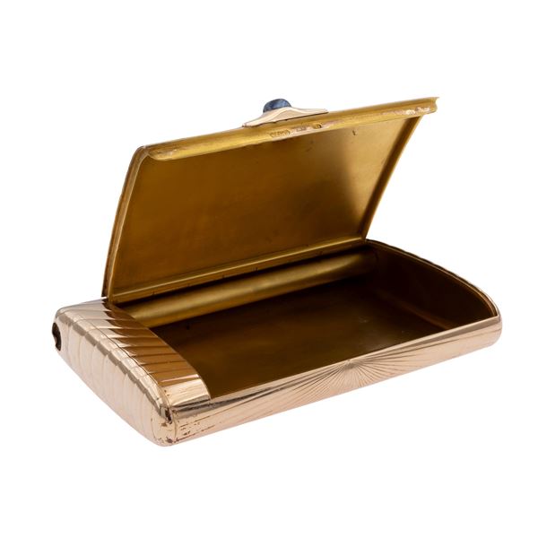 peso 170 gr.orafo Alfred Thieleman, decorata a motivo di raggio di sole, chiusura a scatto con zaffiro cabochon, dimensioni 10,4x7x2 cm.