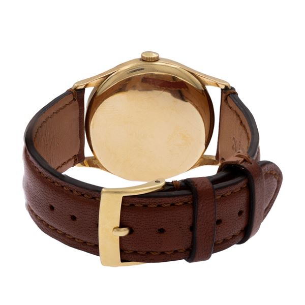 in oro giallo 18kt, ref. 427748 - 269221, cassa tonda 32 mm. quadrante champagne con numeri romani, contasecondi ore 6, corona originale, movimento meccanico a carica manuale, calibro 458, cinturino con fibbia in metallo dorato, cassa, quadrante e movimento firmati