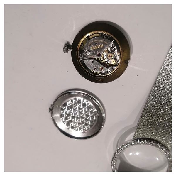 peso 39 gr.in oro bianco 18kt, ref. 5632506, cassa tonda 25 mm. circa, ghiera con diamanti taglio brillante, quadrante argentato con numeri arabi ristampato, lievi difetti, movimento meccanico a carica manuale, bracciale in oro bianco 18kt lavorato a tessuto, lunghezza 17 cm.