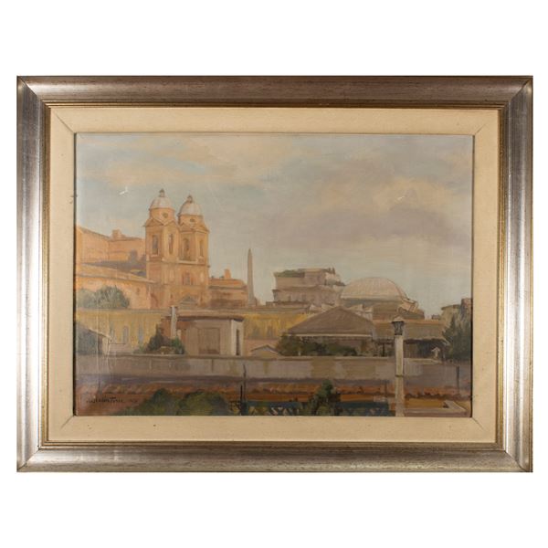 50x70 cm."Veduta di Roma con Trinità dei Monti", 1976, olio su tela, firmato e datato in basso a sinistra, entro cornice