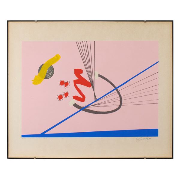 50x60 cm."Una calamita per il sole", serigrafia a colori, es. 45/50, titolata a matita in basso a sinistra, firmata a matita in basso a destra, entro cornice