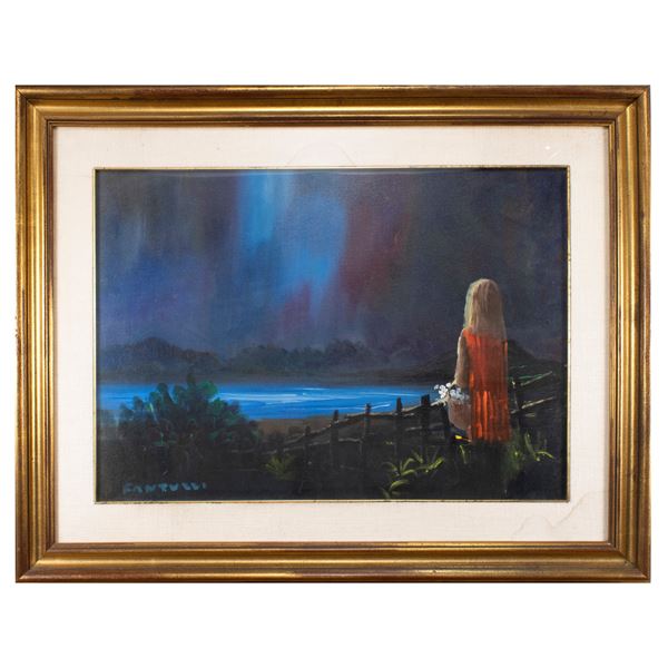 50x70 cm."Ragazza in riva al lago", olio su tela, firmato in basso a sinistra, firmato sul retro, entro cornice