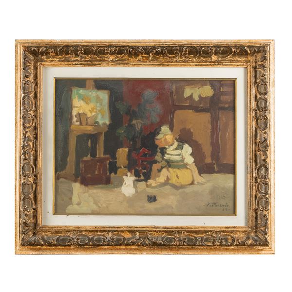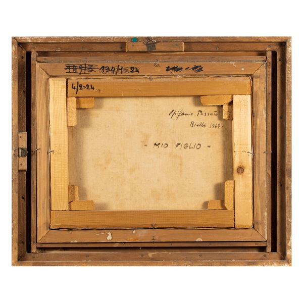 30x40 cm."Mio figlio", 1965, olio su tela, firmato, datato e titolato sul retro, entro cornice