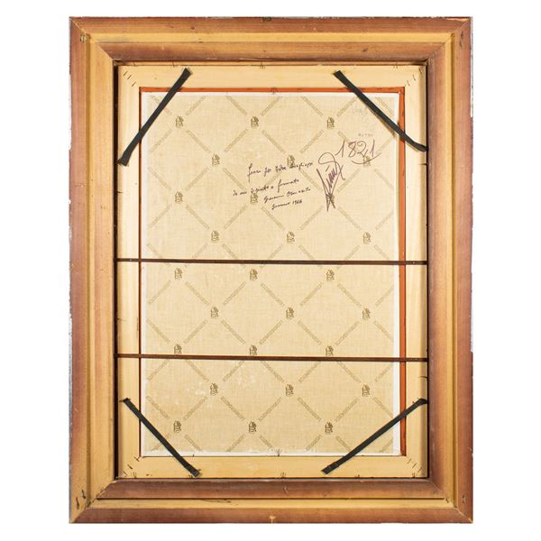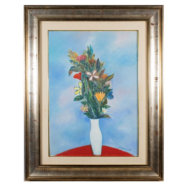 70x50 cm."Vaso di fiori", 1966, olio su cartone telato, firmato in basso a destra, firmato per autentica sul retro, entro cornice
