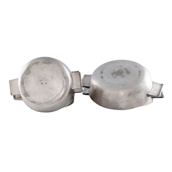 misura massima 5x22x16,7 cm.set di sei legumiere in alpacca argentata, marchio della produzione, difetti