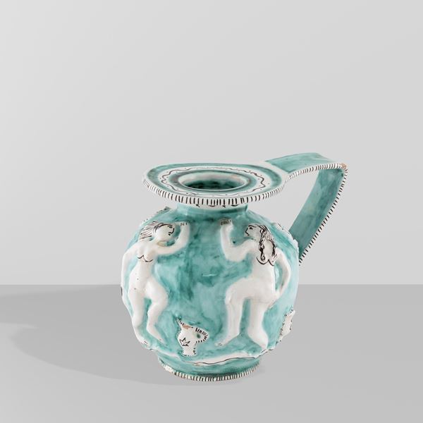 23x28x21 cm.grande brocca in ceramica policroma, marchio della produzione, lievi difetti