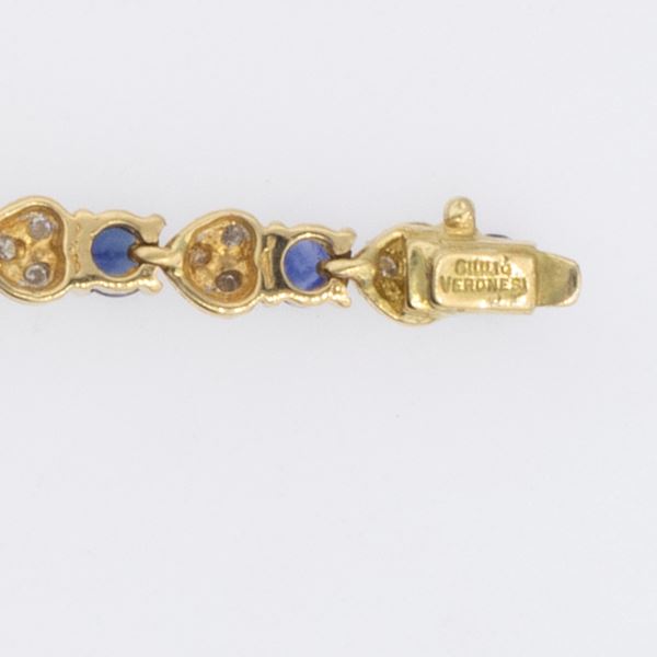 peso 13 gr.zaffiri tondi ct 1,50 circa e diamanti taglio brillante ct 0,80 circa, lunghezza 17 cm.
