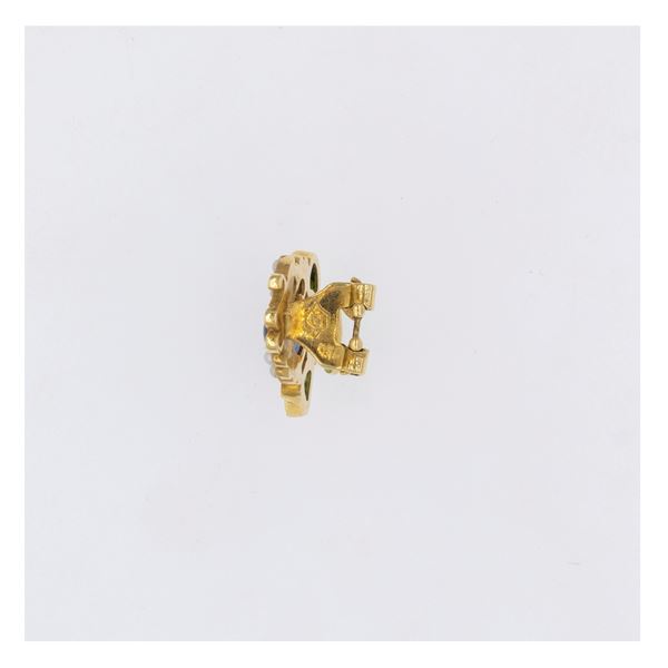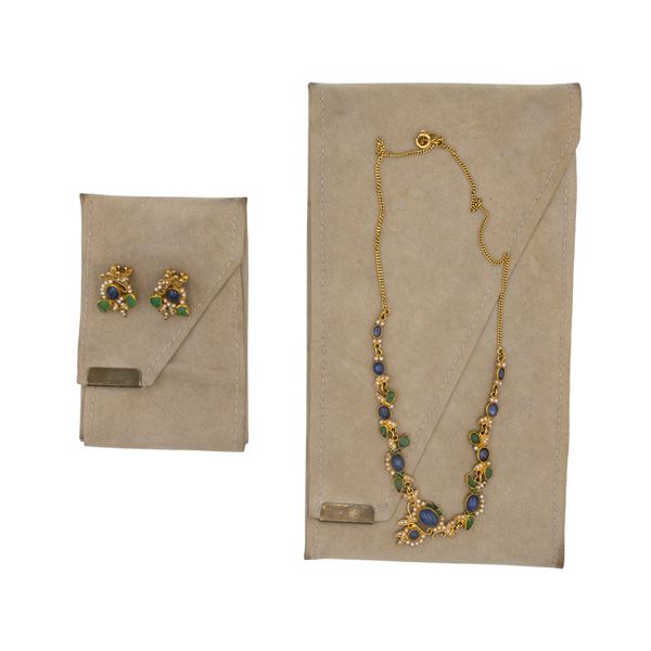 peso 20 gr.zaffiri taglio cabochon, smeraldi incisi e perline, alcune mancanti, orecchini dimensioni 2x1,1 cm. - collana lunghezza 40 cm. completi di custodie in tessuto