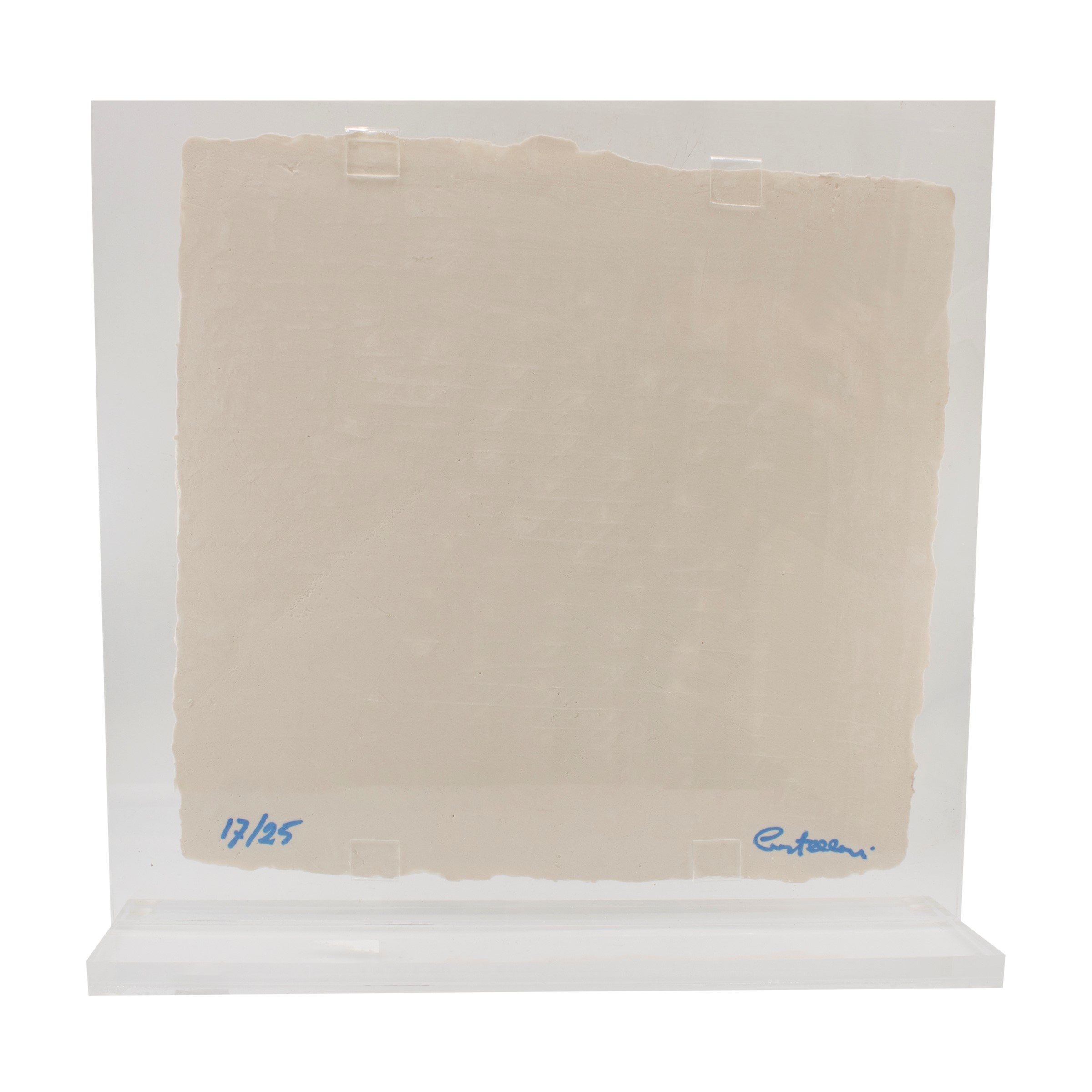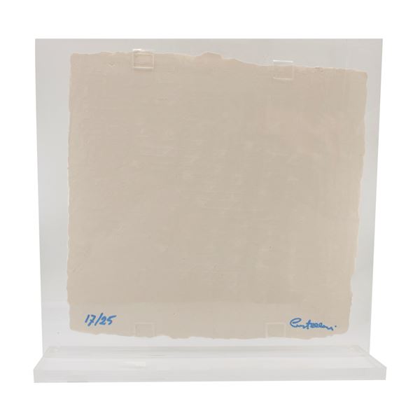 28x30 cm.superficie in rilievo su jesmonite in resina bianca, es. 17/25, firmato e numerato sul retro, entro cornice in perspex, 34x36x10 cm., entro scatola