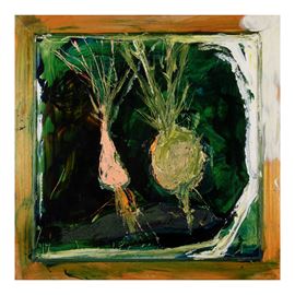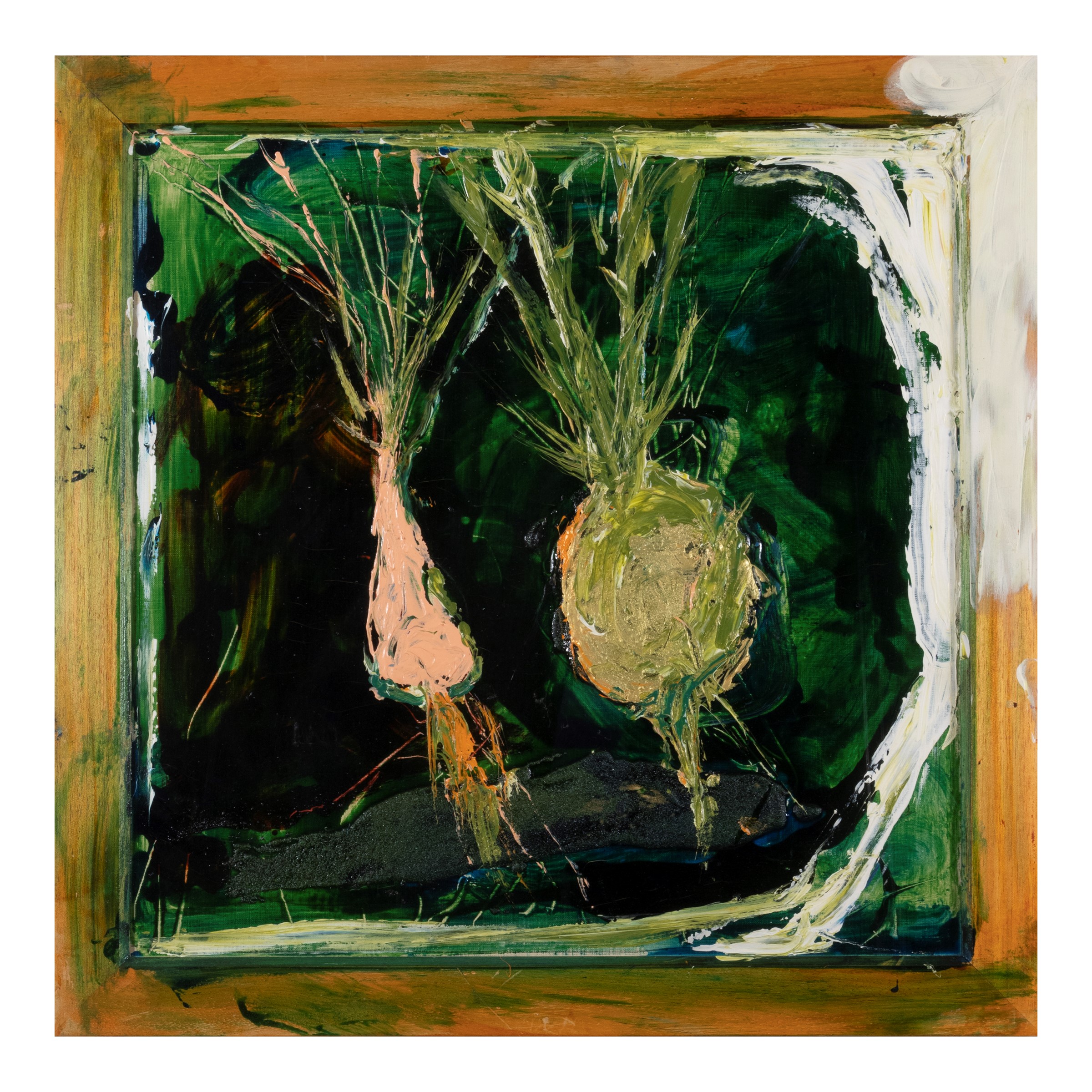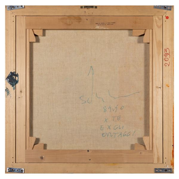 57,5x57,5 cm.smalto, acrilico e sabbia su tela con cornice dipinta, firmato, datato e titolato su retro, entro cornice di plexiglass