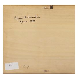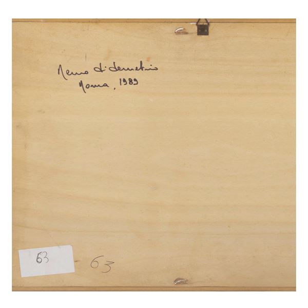 olio e sabbia su compensato, siglato e datato in alto a destra, firmato e datato sul retro, entro cornice