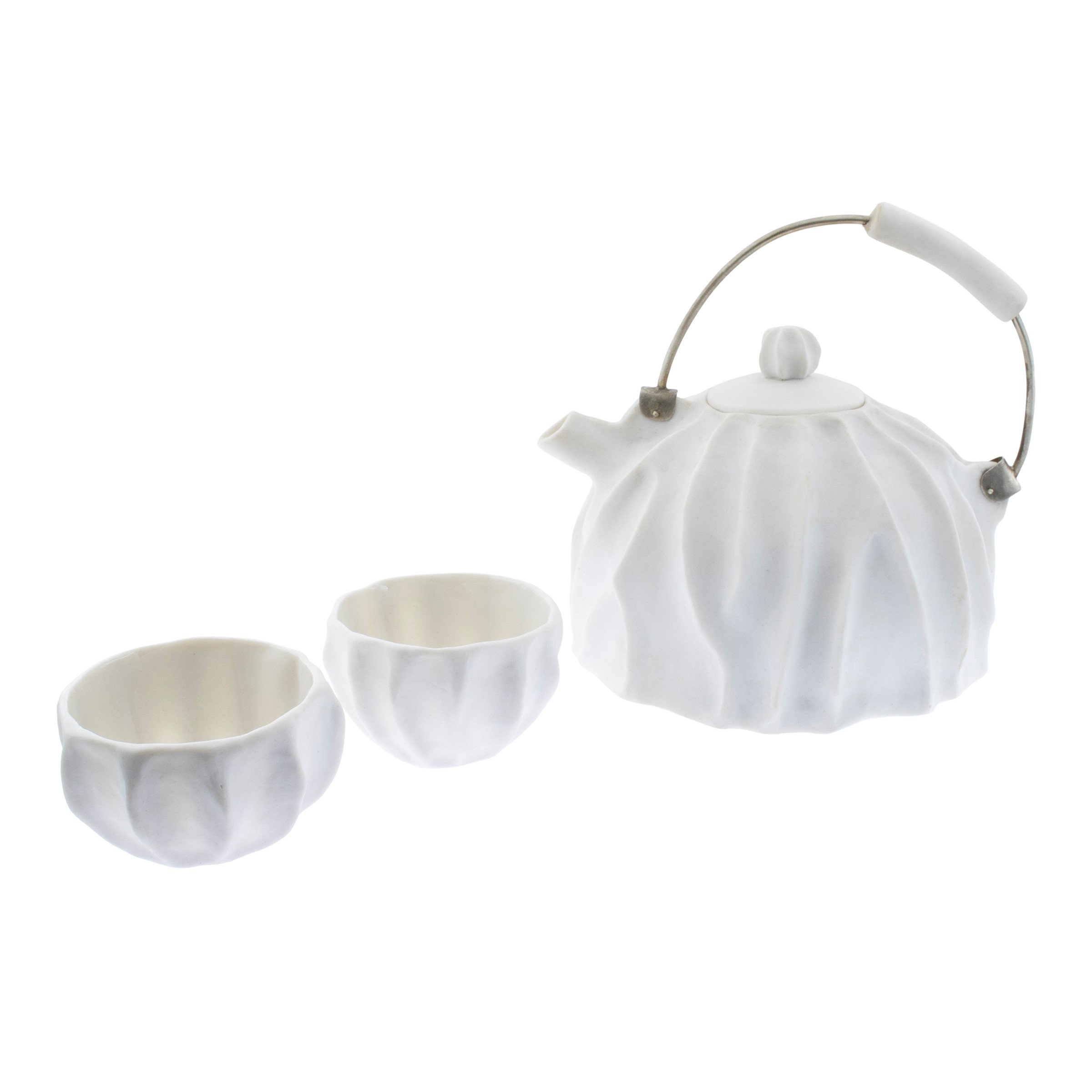 in porcellana modellata a mano e invetriata, teiera con manico in argento, composta da: teiera e due tazzine, marchio sotto le basi