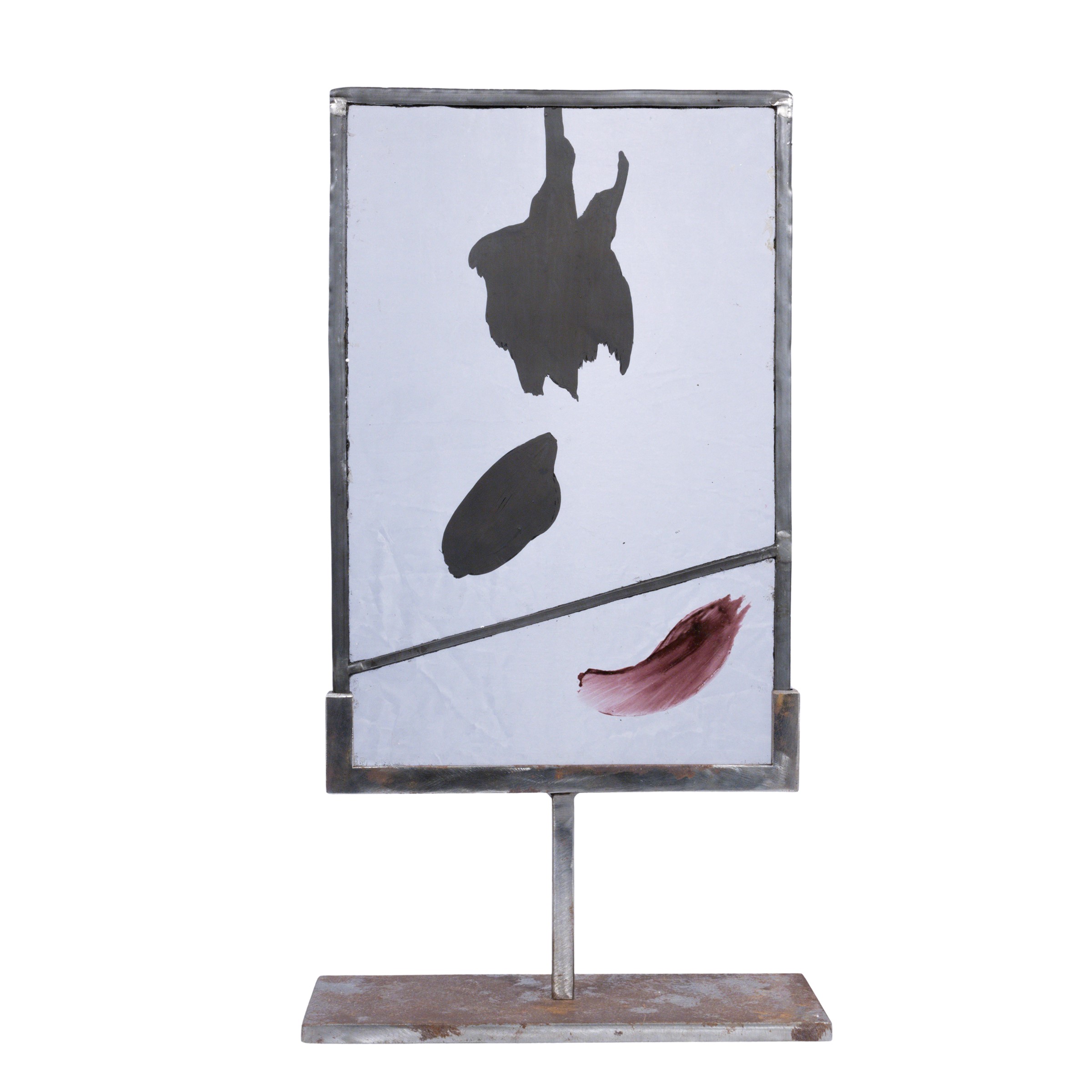 "Reciso", vetro dipinto a mano con smalti, piombatura e cornice in ferro, base rettangolare.