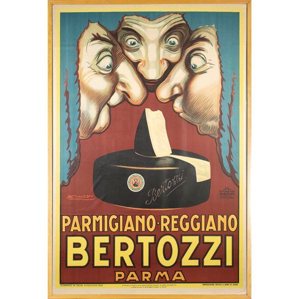140x100 cm.Manifesto "Parmigiano Reggiano Bertozzi Parma", 1930, litografia a colori offset, edizione originale, Edizioni Mauzan Morzenti, entro cornice
