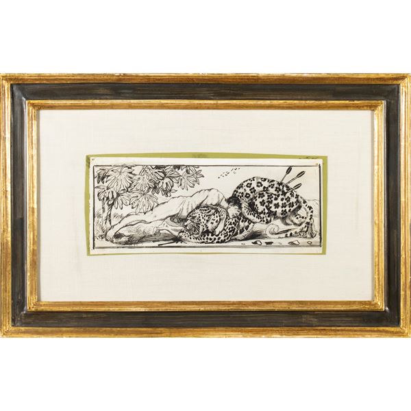 13x32,5 cm."Lotta con belva - Illustrazione per Leonardo", 1906, china e inchiostro su carta, entro cornice