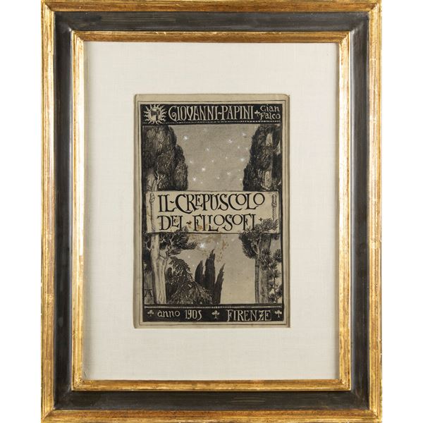 28x19 cm."Il Crepuscolo dei Filosofi - Illustrazione per Leonardo", 1905, china e acquerello su carta, entro cornice