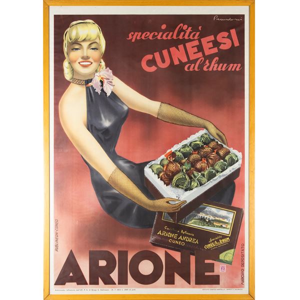 100x70 cm.Manifesto "Specialità Cuneesi al Rum Arione", 1951, litografia a colori offset, edizione originale, stampato da Publineon, Cuneo, entro cornice