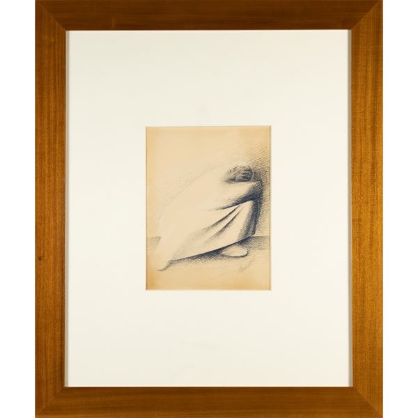 25,5x19,5 cm."Uomo con mantello o Disperazione", inchiostro e carboncino su carta, firmato in basso a destra, entro cornice