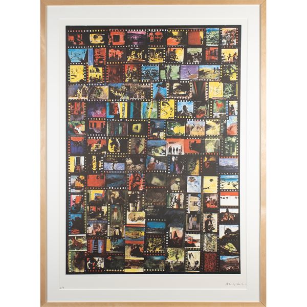 95x69 cm."Tit inventario", 1983, litografia a colori su carta fabriano, es. prova d'artista, titolato in basso a destra, timbro a secco in basso a destra, entro cornice