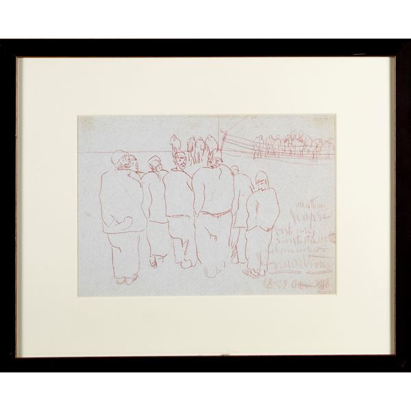 22x30,5 cm."Cortile del manicomio", 1913, sanguigna su carta, firmato e datato in basso a destra, iscrizione in basso a destra, entro cornice